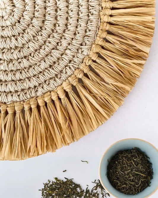 Bleached Jute Crochet Placemat With Natural Raffia Fringes (Pack of 3)