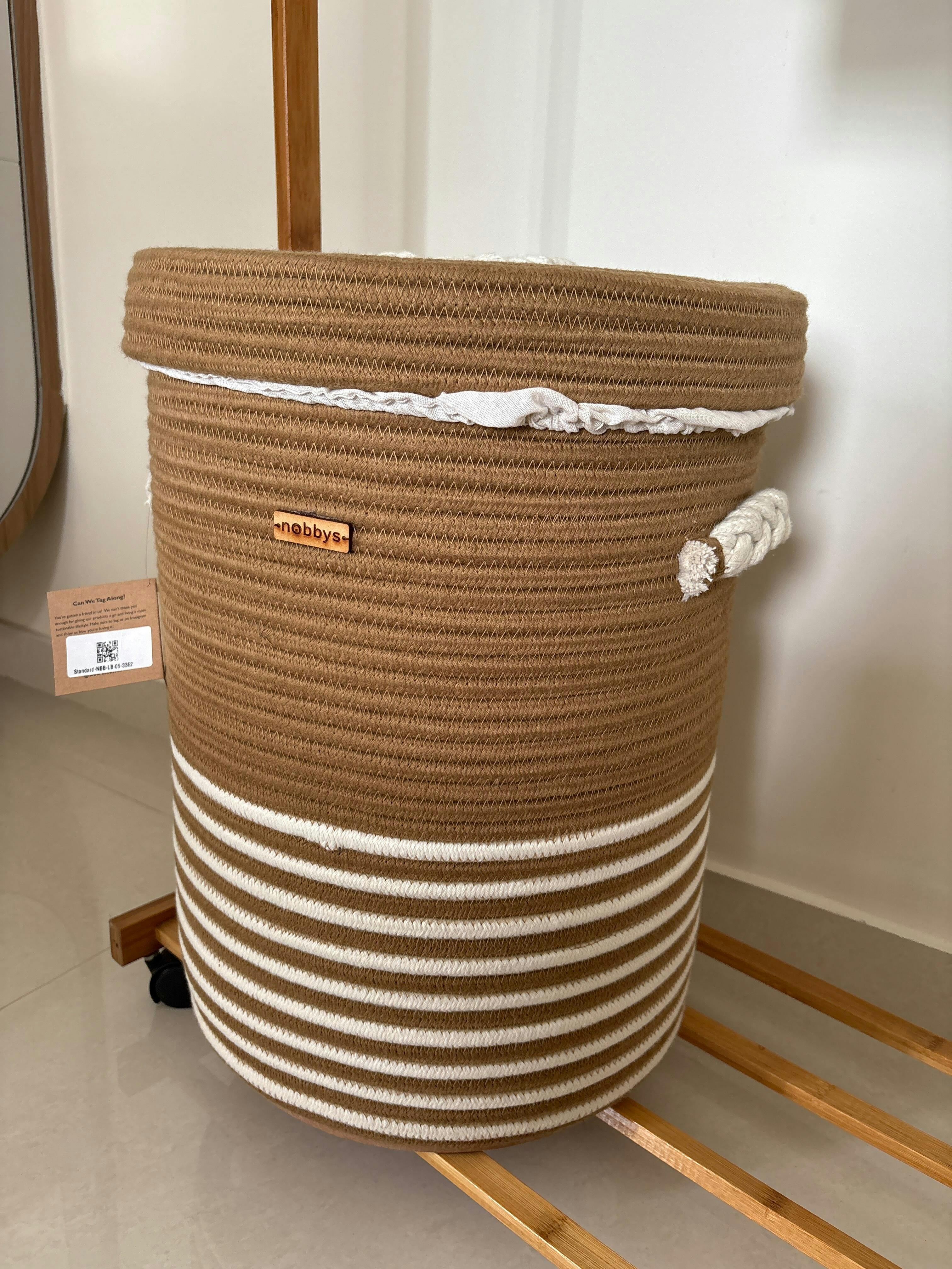 Presenting our bestseller - the Jute Cotton Striped Laundry Basket—a gorgeous blend of the natural texture of jute and the elegance of white. This laundry basket is very sturdy and durable and unlike the other baskets in the market, this will remain sturdy and stay in shape throughout. The elegant stripes on the bottom exude sophistication.